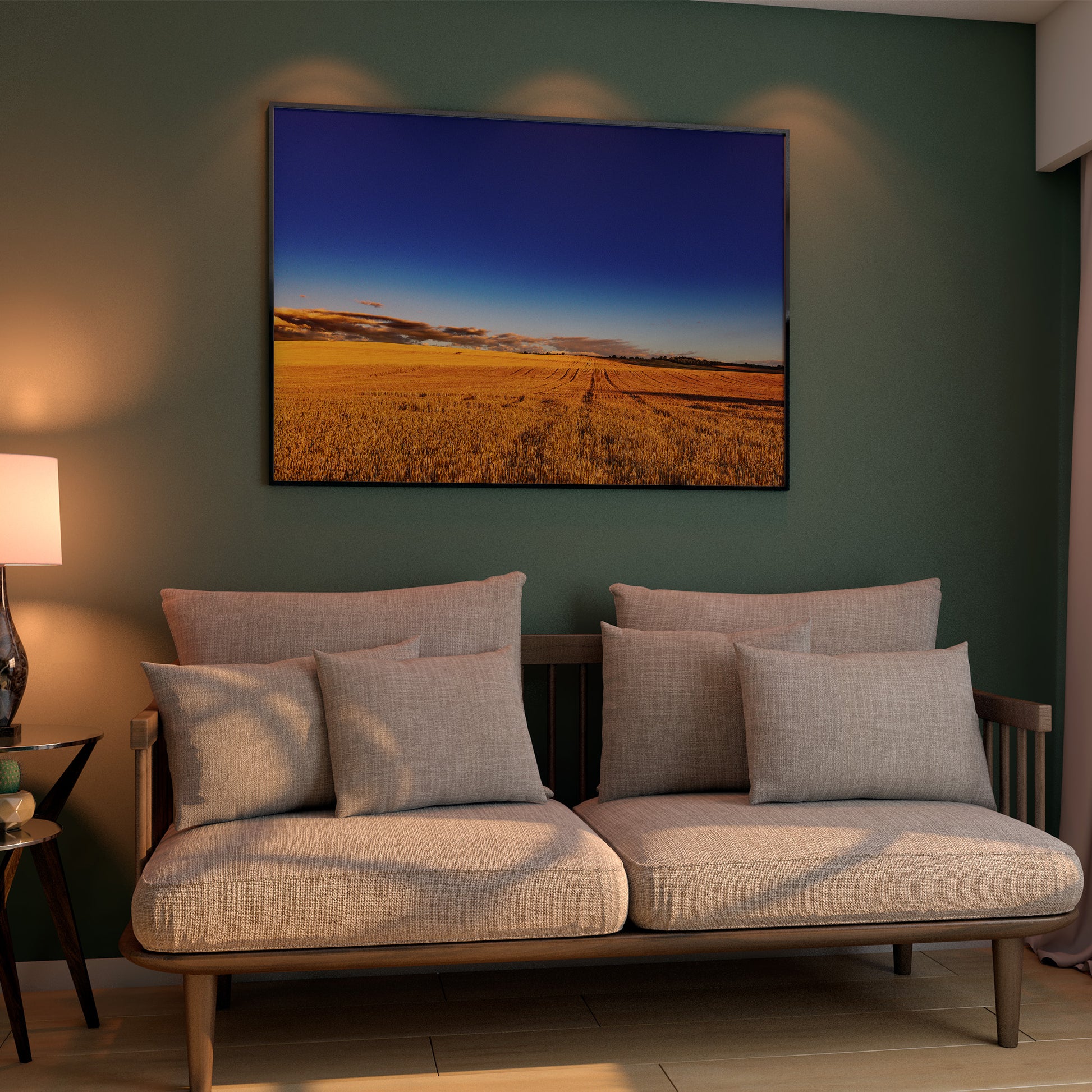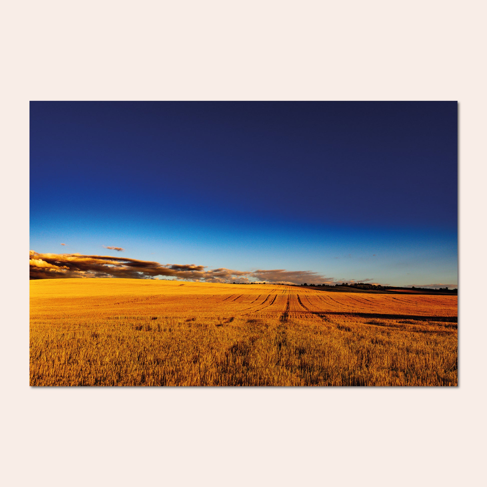 Un champ baigné par la lumière dorée d’une fin de journée d’été, témoin du cycle intemporel de la nature. Quand la photographie de paysage apporte une touche contemplative à votre intérieur et invite à la méditation.